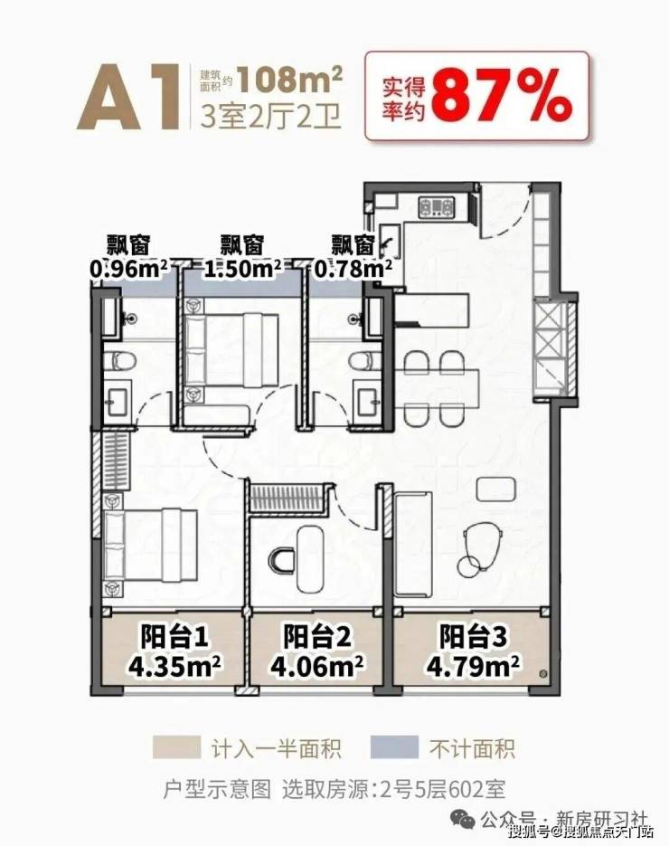 项目108户型,实际能呈现市面约120㎡的空间感;该户型均价约12.65万/㎡,折算实得率,真实建面单价在11.5万/㎡左右。
