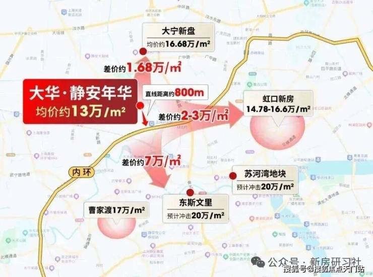 放眼整个静安区,曹家渡17万/㎡,东斯文里和苏河湾项目预计冲击20万/㎡,和大华·静安年华高层差价预计近7万/㎡。