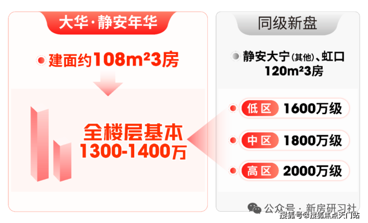 静安大宁、虹口新盘,3房总价约1600万起,若想买中区房源,要到1800万级;而大华·静安年华108㎡3房,全楼层总价基本1300多万,门槛温柔太多。