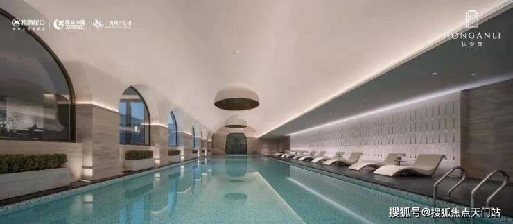 整个泳池天花板,呈现出海派拱形元素,落地玻璃窗外,是下沉式的景观空间: