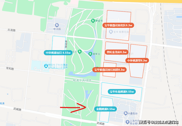 整个项目包含两个地块,地理位置就在宝华紫薇之星南侧,联动价8.55万元/㎡。这块地是2023年四批次土拍时由金隅地产拿下,也是紧挨桃浦绿地的景观房。