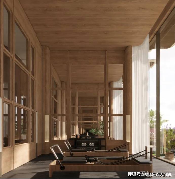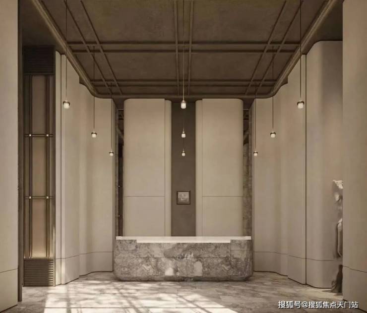 “回归之境”以3500㎡下沉水苑为核心 ,汇聚会客、泳池、茶室等多功能空间,形成仪式感十足的社区舞台。