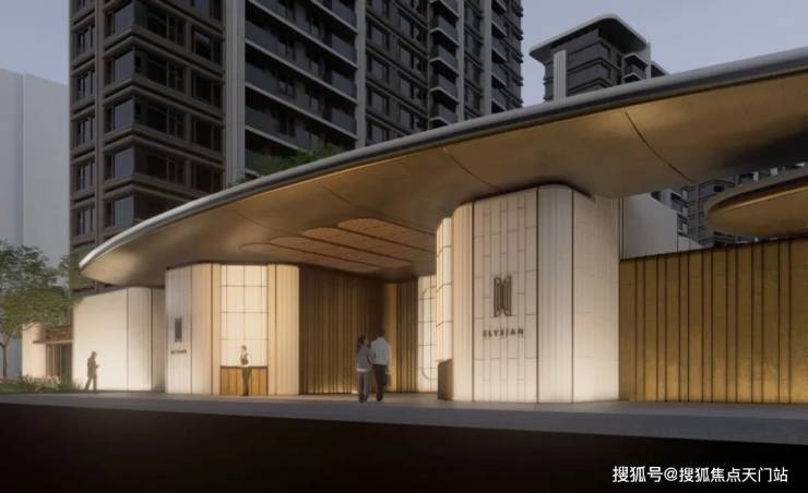 蓝灰色玻璃+仿石铝板+艺术涂料 材质,穿插优雅线条,让建筑这张“脸”看起来更高级。 One&Only酒店式门头 。用 雕塑体块、温润弧面和雅致线条 ,营造具有艺术格调的归家仪式感。