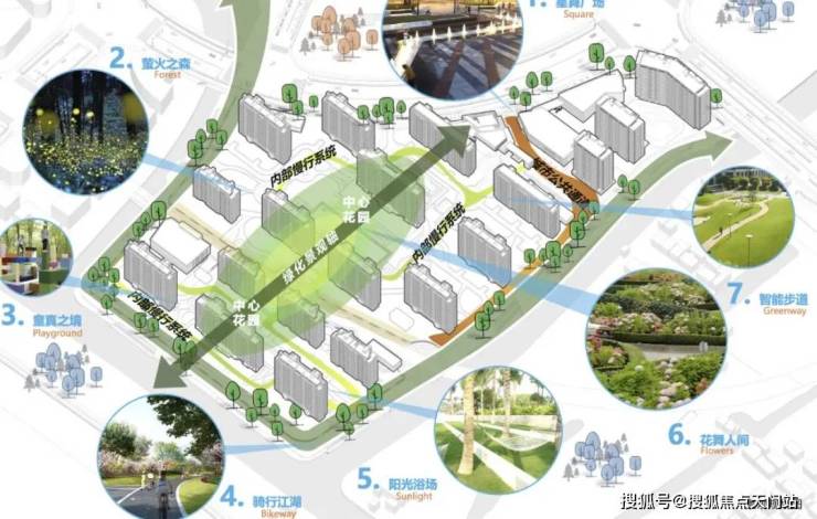社区整体景观通过多维空间居住体验、全景化的生活模式、人性化舒适居住环境三大设计亮点,拉进人与自然的关系。设置了“星舞广场”、萤火之森、童真之境、骑行江湖、阳光浴场、花舞人间以及智能步道7大主题景观共同勾勒出全场景沉浸度假生活,在自然间奔跑嬉戏,会客休闲,每个人都能在这个广阔丰饶的世界里,与自己真诚相对,与家人亲密相依,与志趣相投者愉悦共鸣,让生活以另一种形式自然流淌。