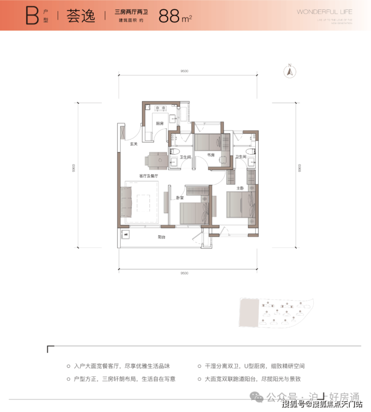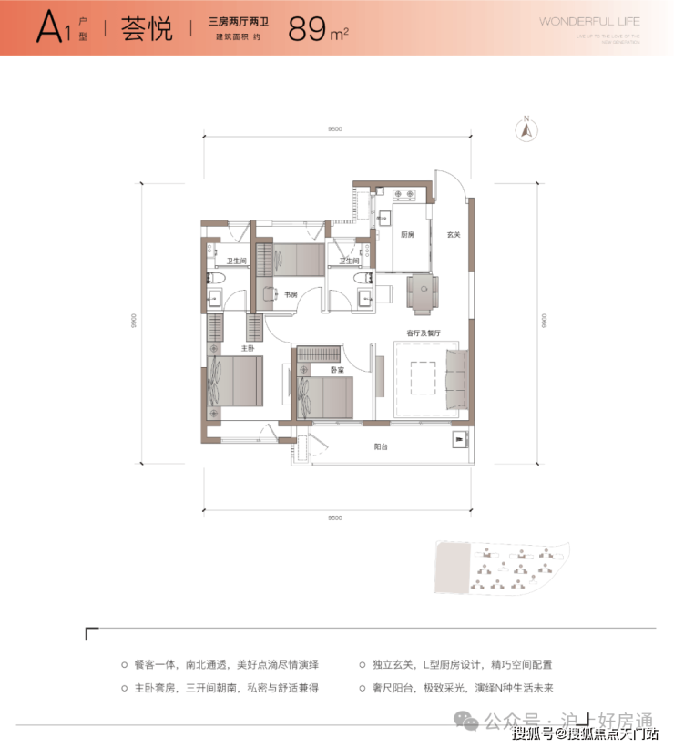 项目主力户型建面约89m²3房2厅2卫,近10米南向面宽,约6.3米的超大阳台打造更舒适的空间尺度感