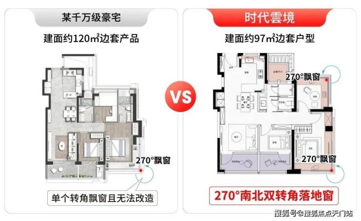 时代雲境建面约95-97㎡的房源不仅是边套,还设计了270°南北双转角落地窗。