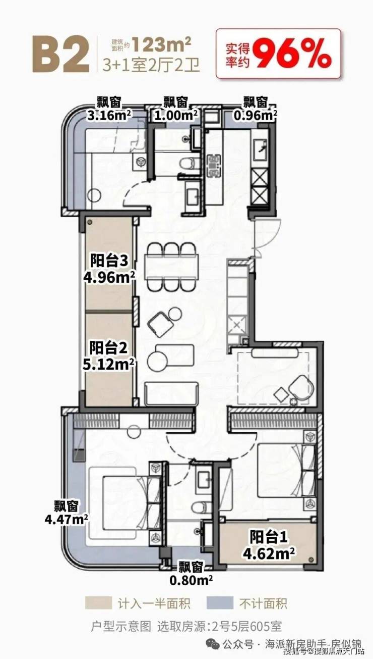 建面约123㎡4房,三阳台面积达约14.7㎡(赠送一半),5飘窗赠送高达约10.4㎡,室内使用面积约117.8㎡,实得率高达约96%,总赠送面积相当于两个次卧。