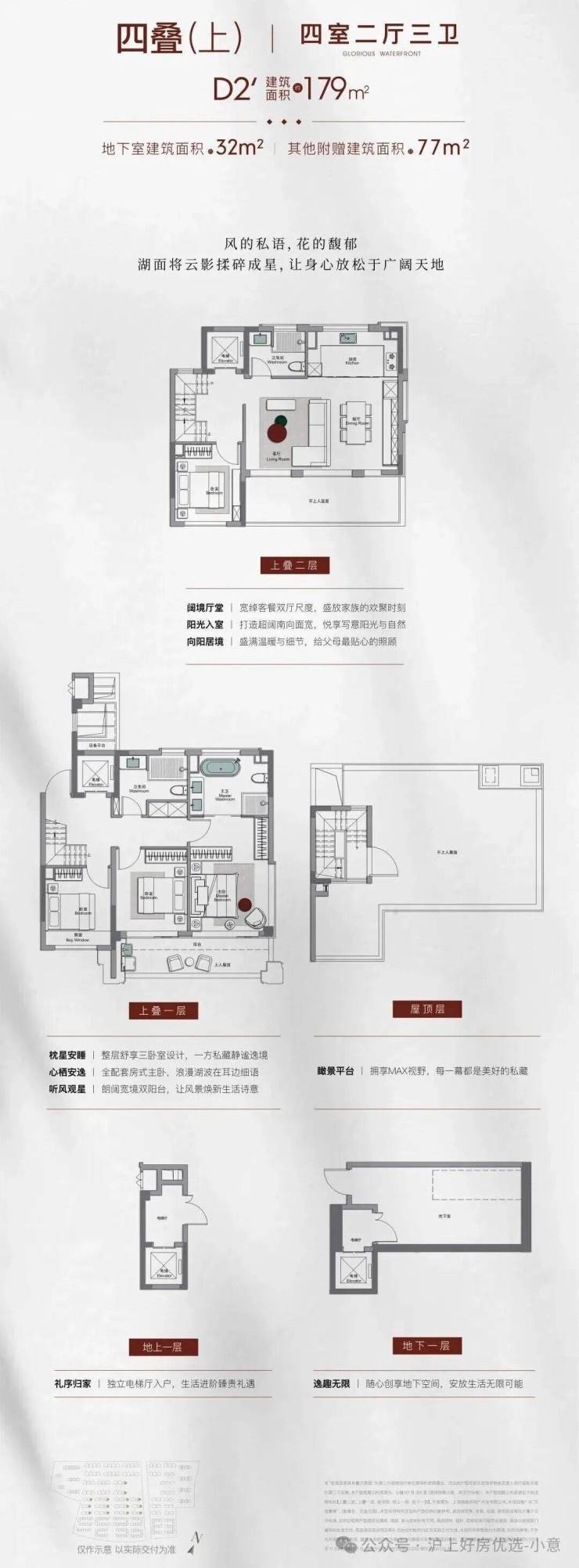 超高得房率,179㎡≥288㎡!除了常规套内空间,更设计有 约32㎡地下室、约77㎡超享空间,为别墅生活带来更多更多可能:第二会客厅、酒窖、私人藏馆、健身房、空中花房等,满足主人个性化的居住需求。