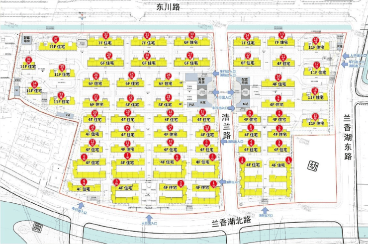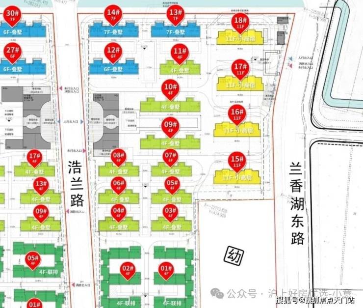 03-04地块:东至兰香湖东路,南至兰香湖北路,西至浩兰路,北至东川路,土地用途普通商品房,容积率1.01;由4幢11F高层住宅、14幢4-7F多层住宅以及若干社区配套用房组成,共计规划约342套可售住宅;