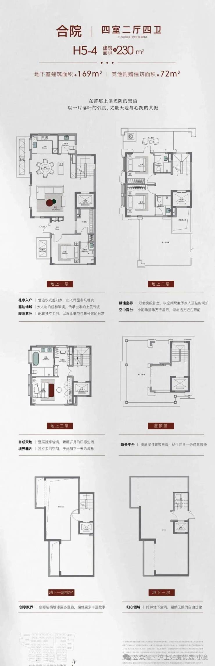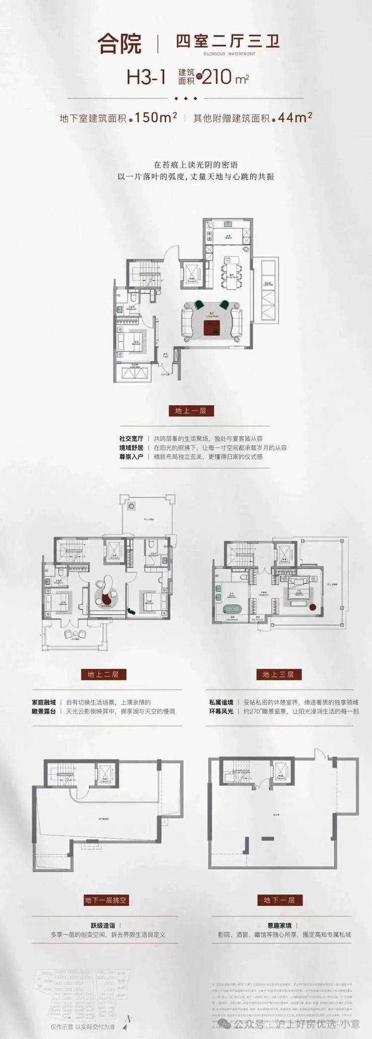 合院:建面约190㎡三室两厅三卫、约210-230㎡四室两厅三卫/四卫,附赠地下室+露台,总价预计约2000万;3层地上+地下室设计。