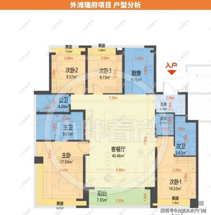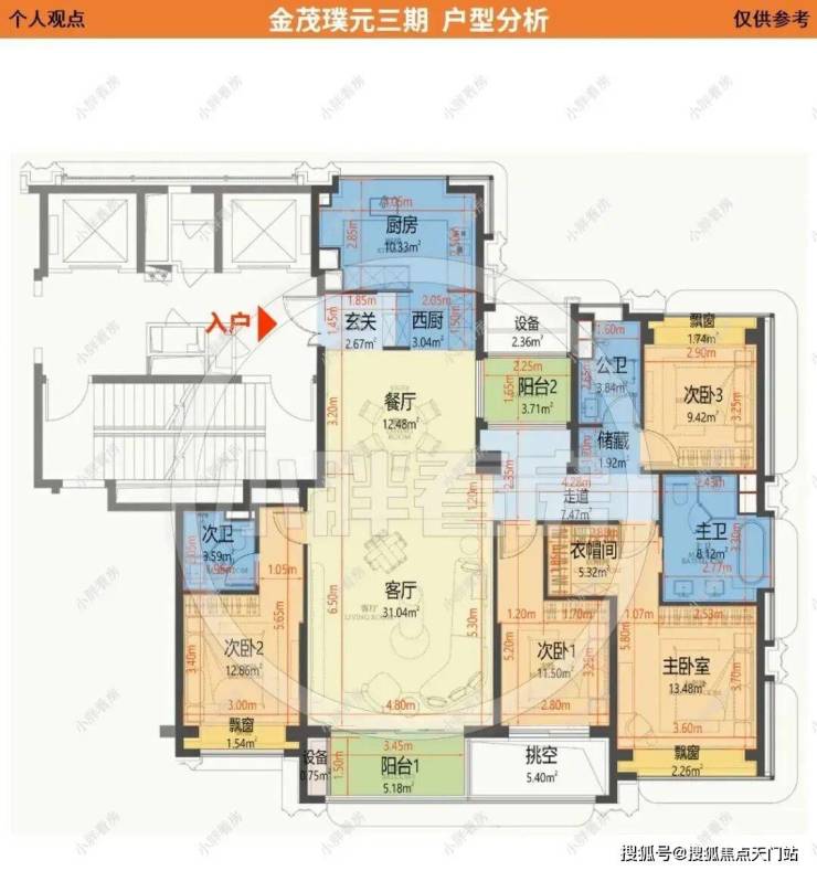 电梯厅没有自然采光,和对门可能有对视问题存在。入户处无独立玄关,餐厅处配有收纳柜,入户仪式感稍缺。
