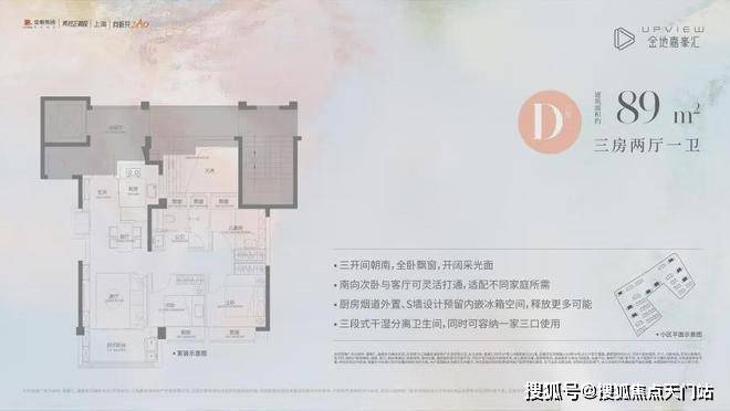 先来看看建面约89㎡三房两厅一卫(D户型),不仅功能完备,而且很好地把控了总价,约350万起即可上车高配品质三房,空间感十足!