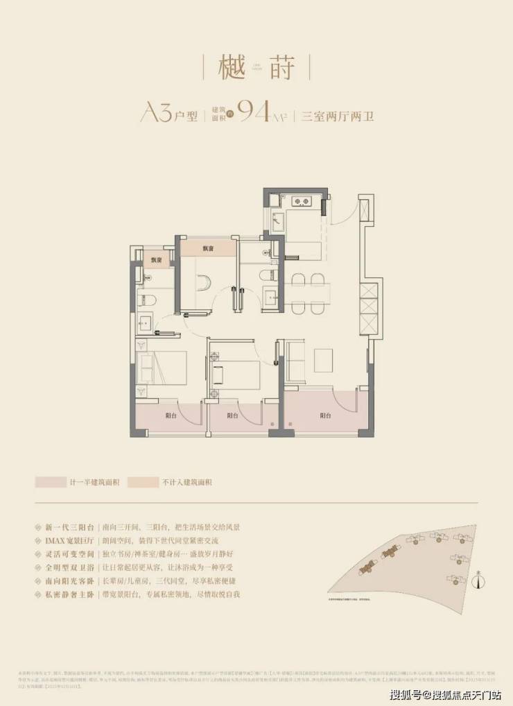 大华望樾的高层建面约94㎡户型做到了三阳台的配置;