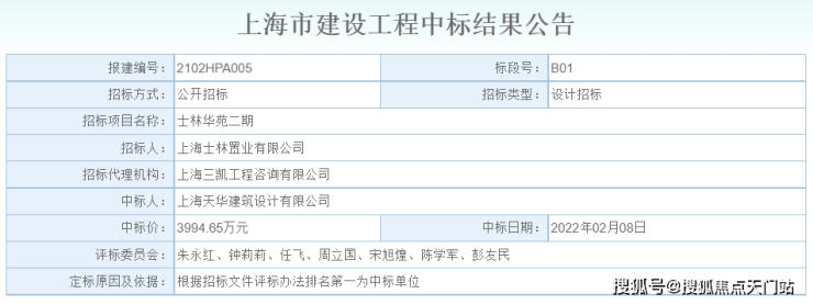 2022年2月8日,上海天华建筑设计有限公司以3994.65万元中标士林华苑二期地块设计项目!