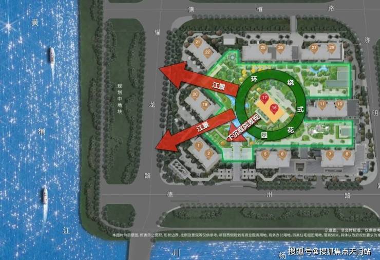 滨江沿岸首个风帆群像精神建筑, 临江楼栋向南偏转32.5° ,高区江景面从 400m延申至2km。既保证中高层最大化瞰江,也让低层拥有无遮挡视野。