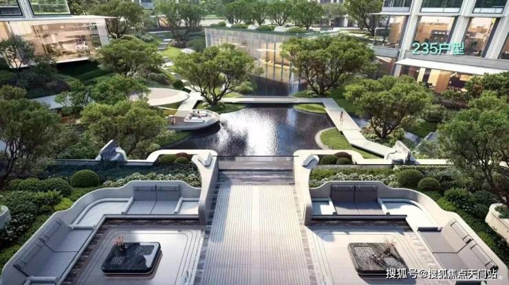 项目235新品户型方正规整,格局圆满;270°边厅设计,三面采光,五根结构柱的巧妙布局创造出极致的窗墙比与全落地玻璃幕墙,将中心园林的绿意与下沉庭院的景致最大化引入室内。