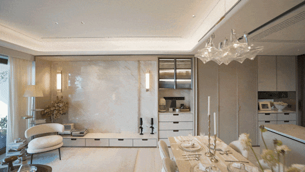 另外,因为豪宅客户对于精装美学有自己的审美,所以此次项目提供了超越行业的 三大柔性定制 ——艺术家联名定制入户门把手、艺术家联名定制艺术门牌挂画以及墙面饰面&岛台等区域提供多款石材/岩板款式。